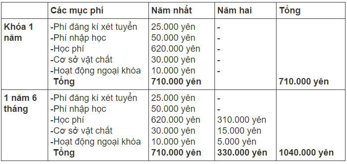 - Khóa học: 1 năm, 1 năm 6 tháng